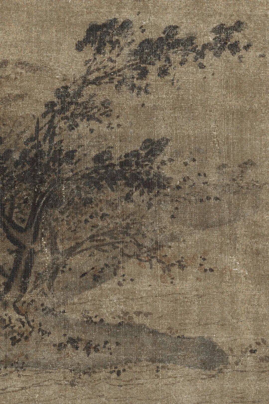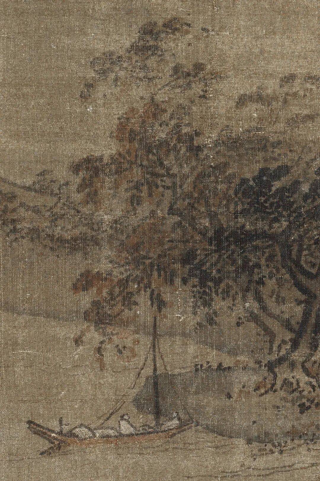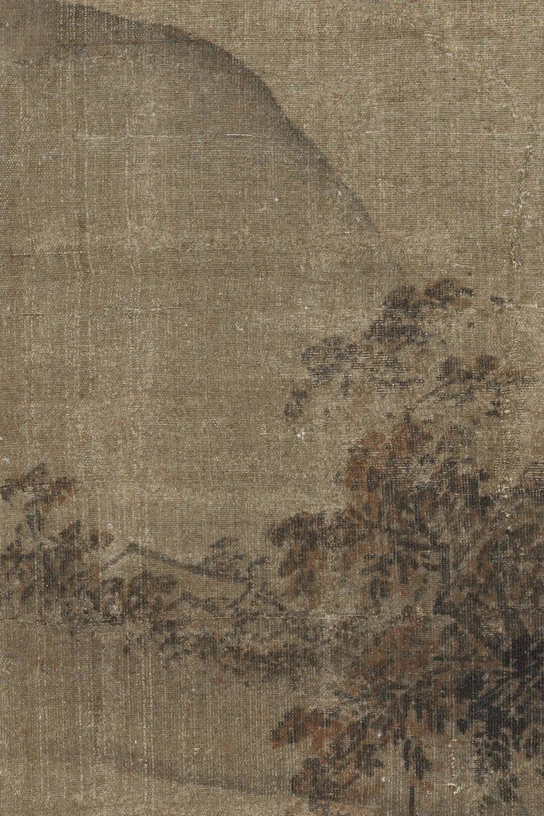 其独创的“拖泥带水皴”在此作中展现得淋漓尽致:先以秃笔饱蘸浓墨侧锋横扫山石轮廓,未等干透即以淡墨水笔扫染皴纹,墨色在绢帛上自然渗化,形成“浓破淡、淡破浓”的层次,使坚硬的花岗岩体质感与湿润的江南烟雨融为一体。画中人物虽仅豆点大小,却以简笔勾勒出渔翁收网的动态,与远处若隐若现的楼阁形成“疏可走马,密不透风”的对比,这种“以少胜多”的视觉策略,暗合南宋偏安一隅的时代心境。