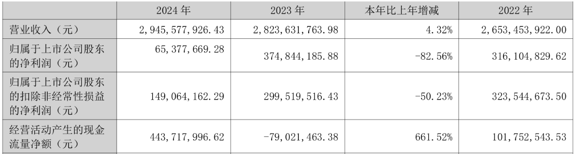 2024年,新强联实现营业收入29.46亿元,同比增长4.32%;归属于上市公司股东的净利润6537.77万元,同比下降82.56%;归属于上市公司股东的扣非净利润1.49亿元,同比下降50.23%;经营活动产生的现金流量净额为4.44亿元,上年同期为-7902.15万元。