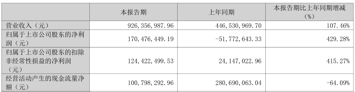2025年第一季度,公司实现营业收入9.26亿元,同比增长107.46%;归属于上市公司股东的净利润1.70亿元,上年同期为-5177.26万元;归属于上市公司股东的扣非净利润1.24亿元,同比增长415.27%;经营活动产生的现金流量净额为1.01亿元,同比下降64.09%。
